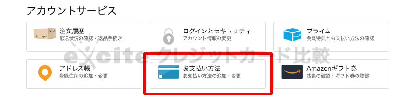 「アカウント&リスト」をクリックすると、上記画像のような画面が表示されます。6つのメニューの中から下段真ん中の「支払い方法」をクリックしましょう。