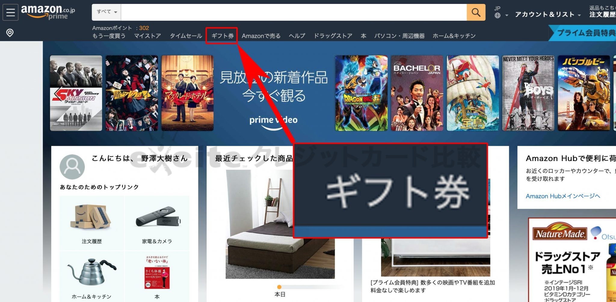 まずは、Amazon公式HPにアクセスしてサイト上部のメニューから「ギフト券」をクリックしましょう!
