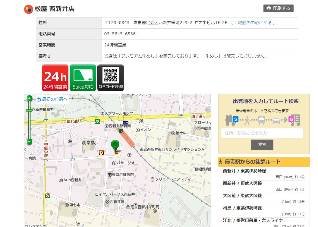 各店舗の名前をクリックすると、その店舗の営業時間や地図、そしてSuica対応なのかQRコード決済が可能なのか分かるようになっています。