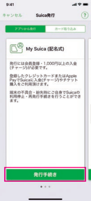 ② Suica発行画面で発行するSuicaの種別を選択し、「発行手続き」をタップします。