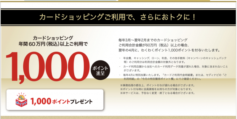 - 年間60万円以上(税込)でカードショッピングご利用で次年度1,000ポイント付与