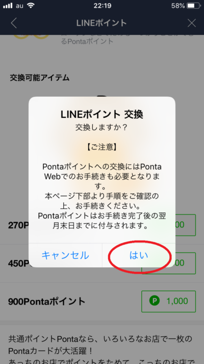 LINEポイントを本当に交換するのか?注意事項と一緒に表示されますので、「はい」をタップ。