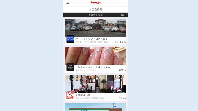 3. 現在地から近い順で、楽天ペイが利用できる店舗が表示されます。