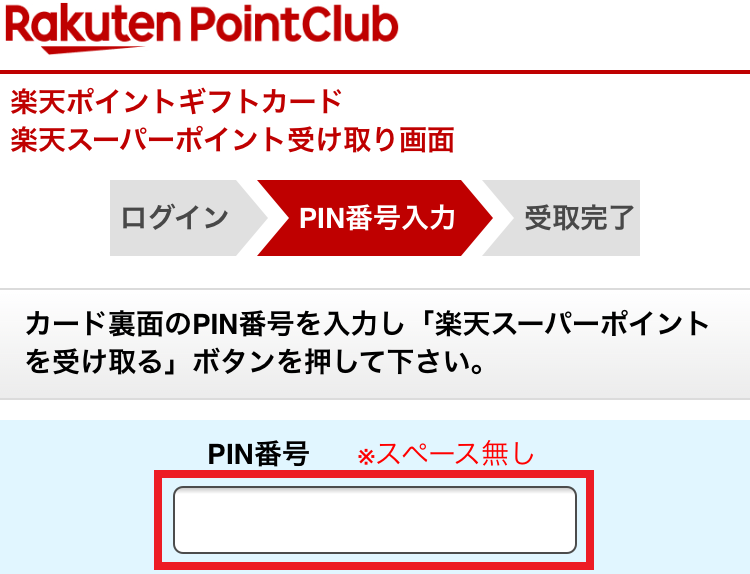 このメールの中にPIN番号というものが記載されているんですが、このPIN番号を「楽天ポイントギフトカード 受け取り画面」で入力することで、楽天ポイントを受け取ることができます。