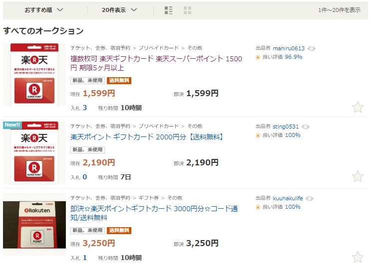 そして、ヤフーショッピングで楽天ポイントギフトカードを購入するよりも、ヤフオクで楽天ポイントギフトカードを落札する方がお得なケースも多いです。