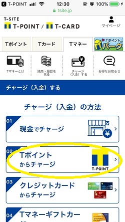 TポイントからTマネーへのチャージは、Tサイト(Tポイント/Tカード)のTマネーサービスページからのみで可能です。