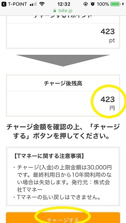 チャージが完了しました!になるとTポイントが減って、Tマネーが増えます。
